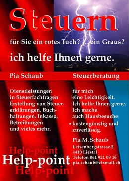 help point Steuerberatung P. Schaub ist ein Kleinunternehmen in Liestal. Ich biete Finanzdienstleistungen rund um Steuern (ganze Schweiz), Buchhaltung und Verwaltung an. Diese beinhalten das Ausfüllen der Steuererklärung, Rechnungswesen für KMU's und die Verwaltung von Immobilien. Das Unternehmen help point Steuerberatung P. Schaub besteht seit 2009. Bei der Unternehmensgründung brachte ich 21 Jahre Erfahrung im Steuerwesen und in der Verwaltung mit ein. Vertrauen wird bei mir gross geschrieben. Ich biete meinen Kunden einen qualitativ hochstehenden Service an, schnell und zu fairen Konditionen. ...